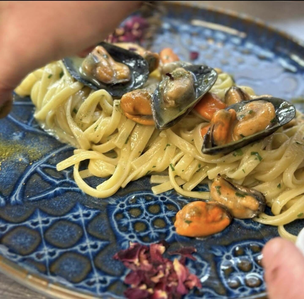 Linguine cozze e vongole con polvere di prezzemolo agli agrumi.